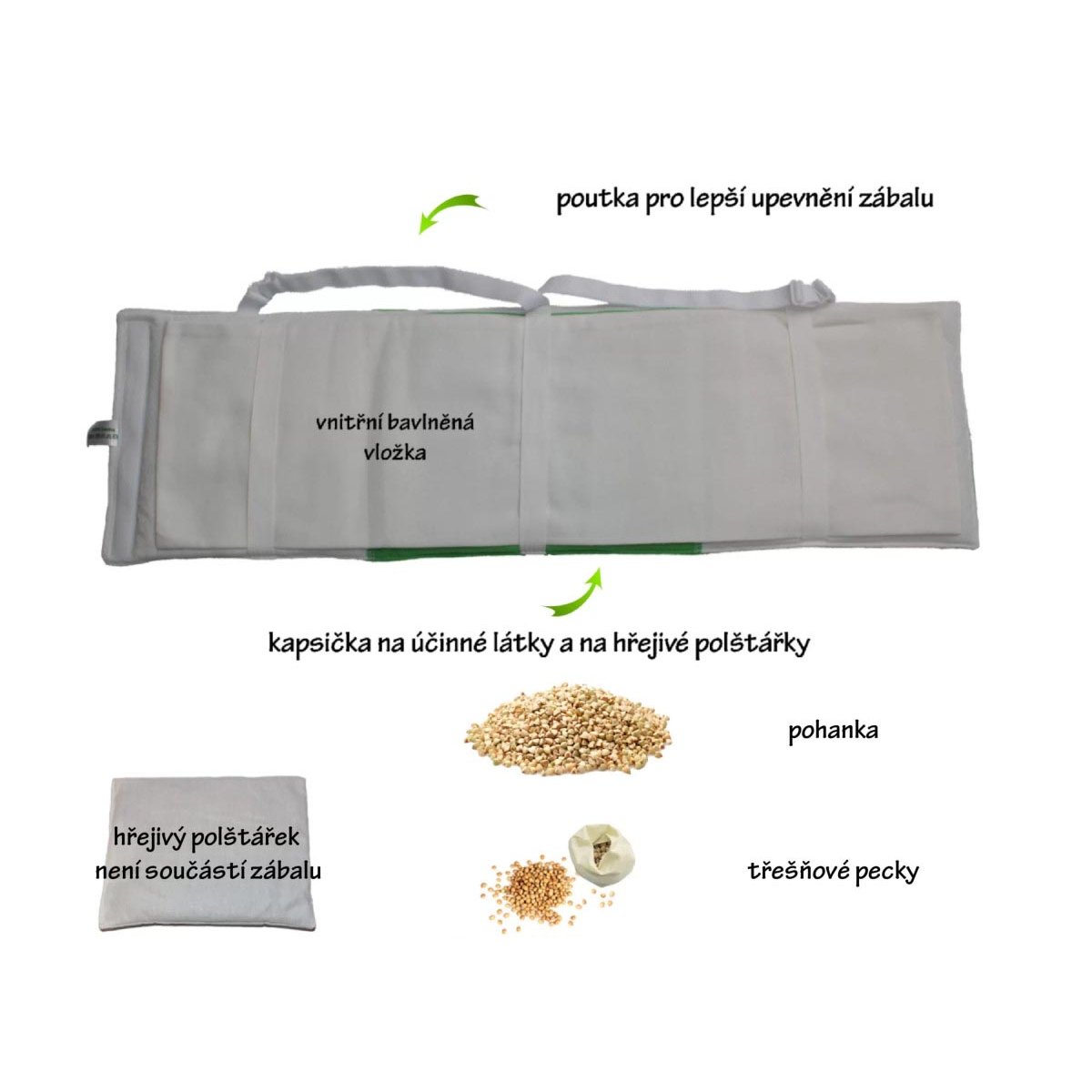 Zábal můžete použít i jako suchý, teplý obklad. Pro vyšší tepelný účinek stačí vnitřní bavlněnou část nahřát žehličkou. Pro suché a teplé obklady jsou také ideální hřejivé polštářky, které jsou plněné pohankou nebo třešňovými peckami a stačí je vložit do vnitřní kapsy zábalového pásu. Pomáhají účinně zmírnit dětskou břišní koliku, nachlazení bez teplot, zánět průdušek bez teplot, zánět močového měchýře a močových cest, bolesti ledvin a vlhký kašel. Doporučujeme polštářky v Bio kvalitě z naší nabídky, u kterých najdete návod k používání.