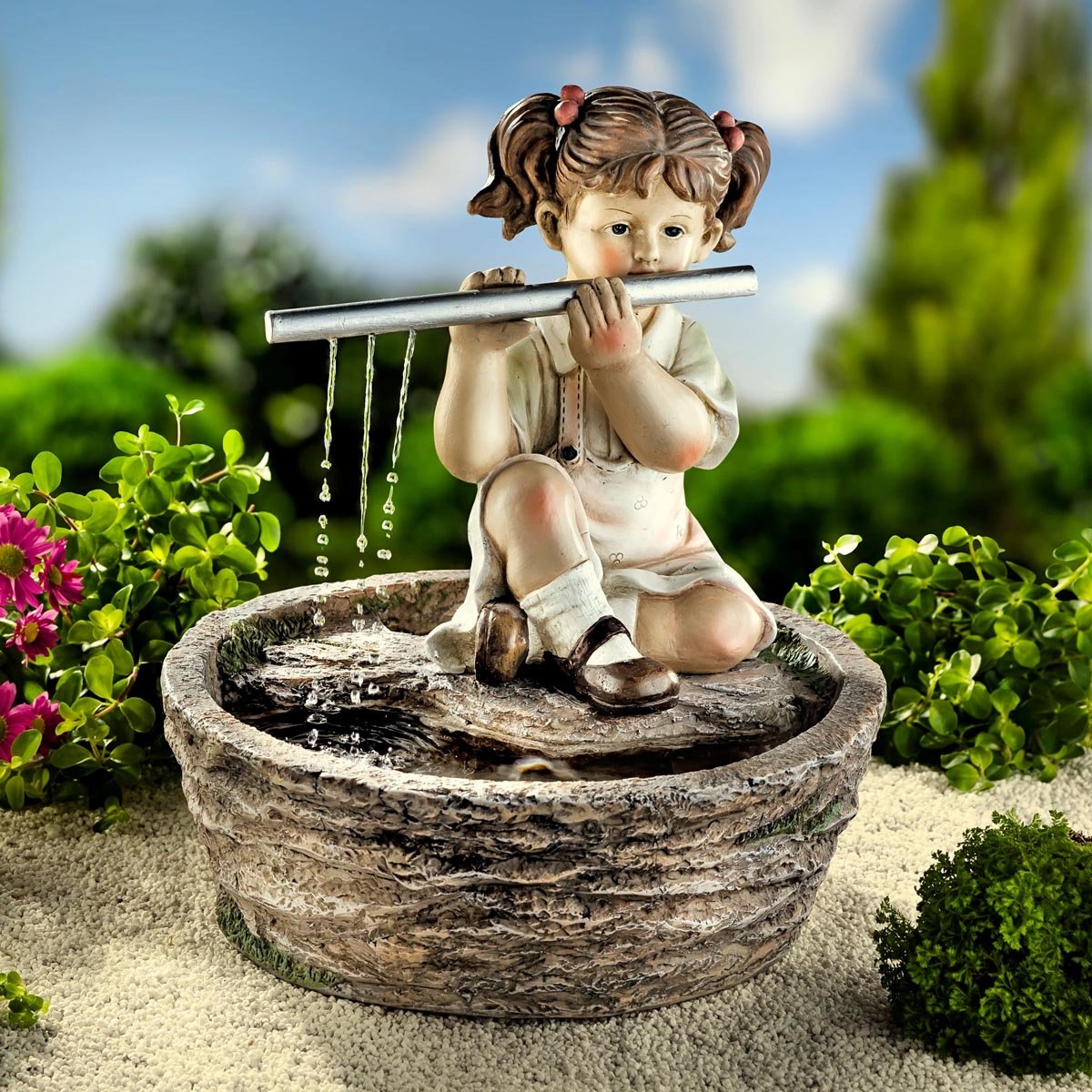 Velmi okouzlující poutač pro zahradu, terasu nebo balkon, který vybízí k zastavení a relaxaci při pohledu na něj. I bez vodního toku je tato zahradní fontána obohacením vašeho okolí, protože scenérie s flétničkou je navržena s velkým důrazem na detail a vybarvena v jemných barvách.