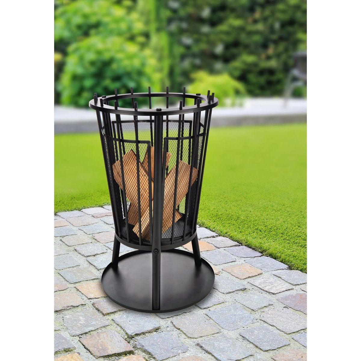 Moderní přenosné ohniště s ochranou proti jiskrám je velmi efektní a šetrné k trávníku i terase. Vzdušná konstrukce koše usnadňuje hoření a umožňuje vytvořit krásný oheň.