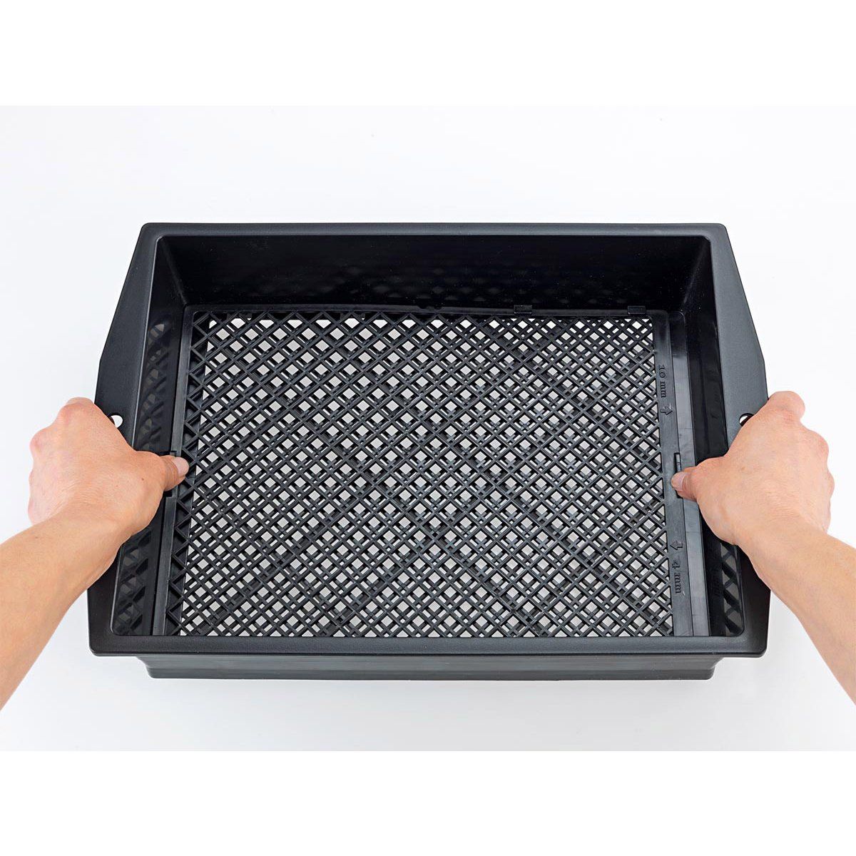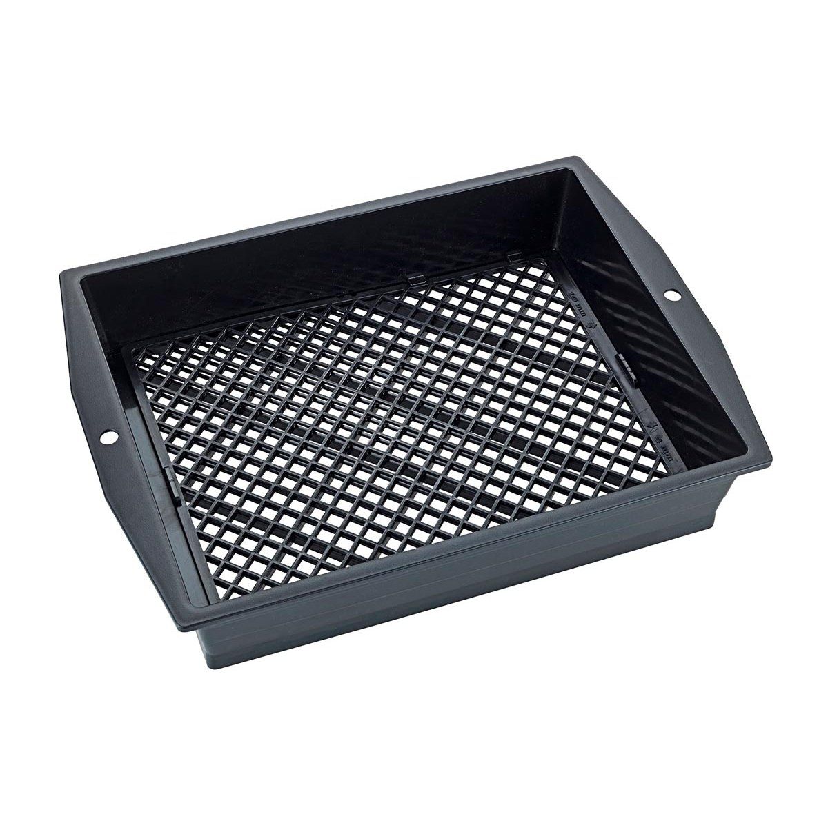Obdélníkový tvar s vyššími okraji zabraňuje vysypávání materiálu při práci a praktická madla zajišťují pohodlnou manipulaci. Síto je vyrobeno z kvalitního plastu, který je odolný vůči vlhkosti, snadno se čistí a nekoroduje.