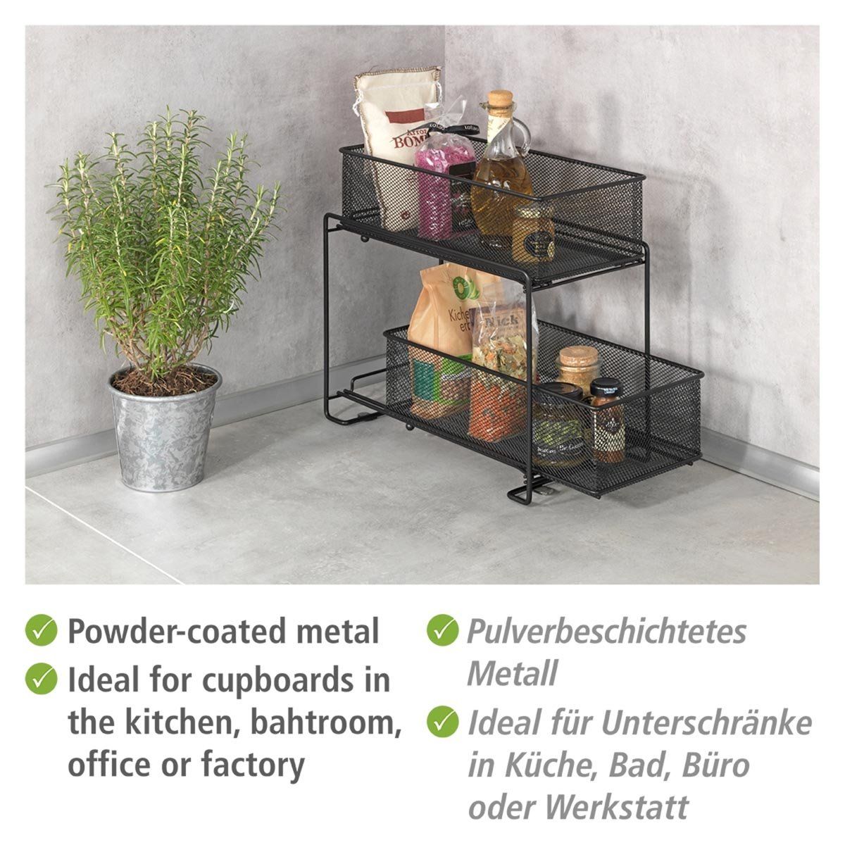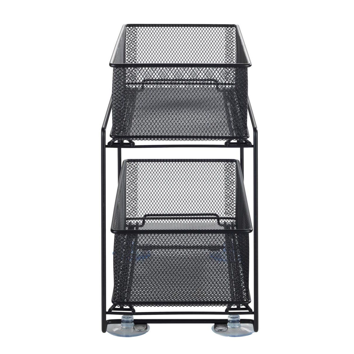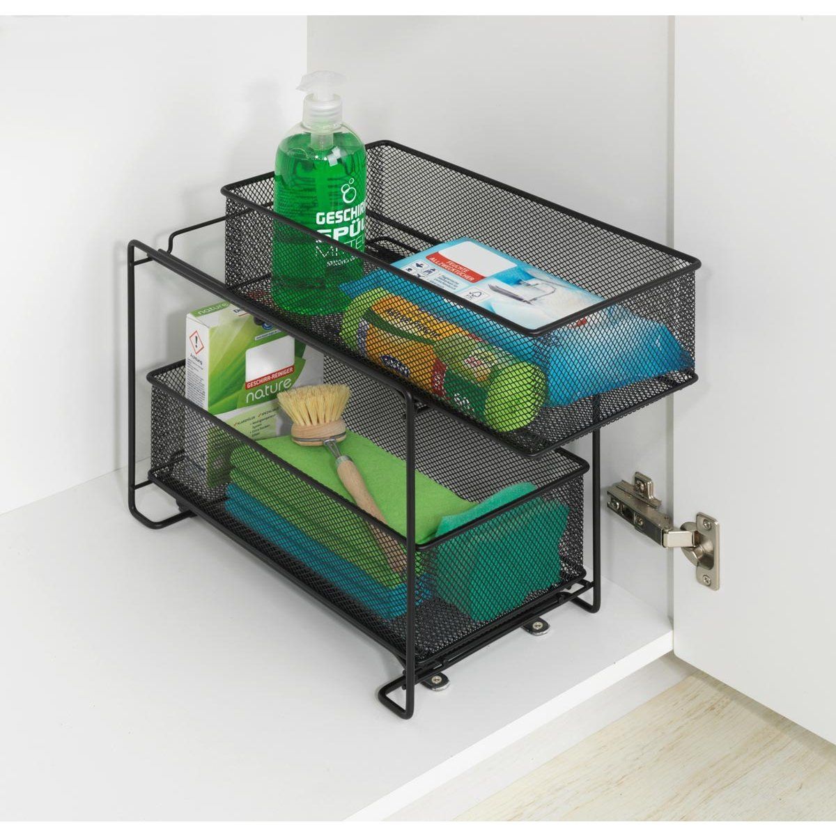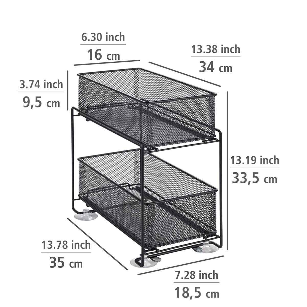 Praktický kovový organizér do kuchyně se zásuvkami vám pomůže lépe využít prostor ve skříňkách a udržet domácnost přehledně uspořádanou. Díky dvěma úrovním s vysouvacími košíky nabízí snadný přístup ke všem uloženým věcem a je ideální jako organizér do kuchyně i organizér pod dřez. Skvěle poslouží pro potraviny, koření, čisticí prostředky nebo kuchyňské doplňky. Stabilní kovová konstrukce zajišťuje dlouhou životnost a moderní vzhled.