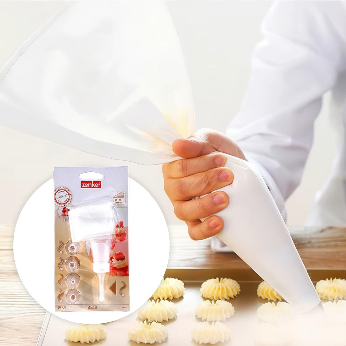Sáček o rozměrech cca 28 × 14 cm je vyroben z extra pevného materiálu, je omyvatelný a opakovaně použitelný. Sada představuje univerzální pomůcku pro domácí i profesionální zdobení cukrářských výrobků. Díky pěti různým špičkám snadno vytvoříte originální dekorace pro každou příležitost – od slavnostních dortů až po vánoční perníčky.