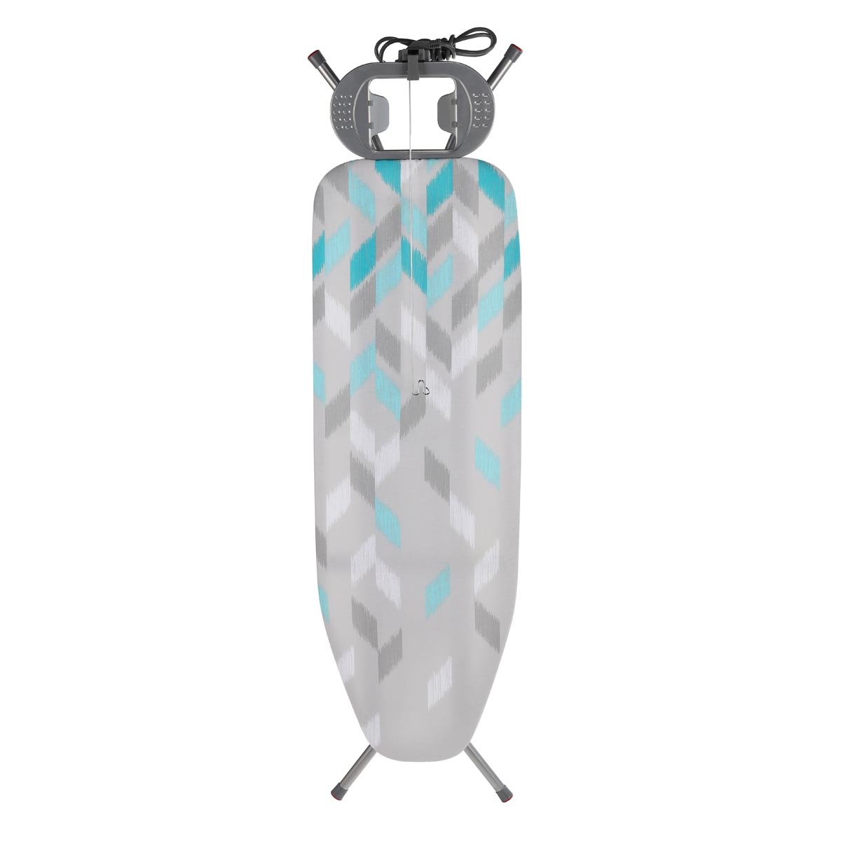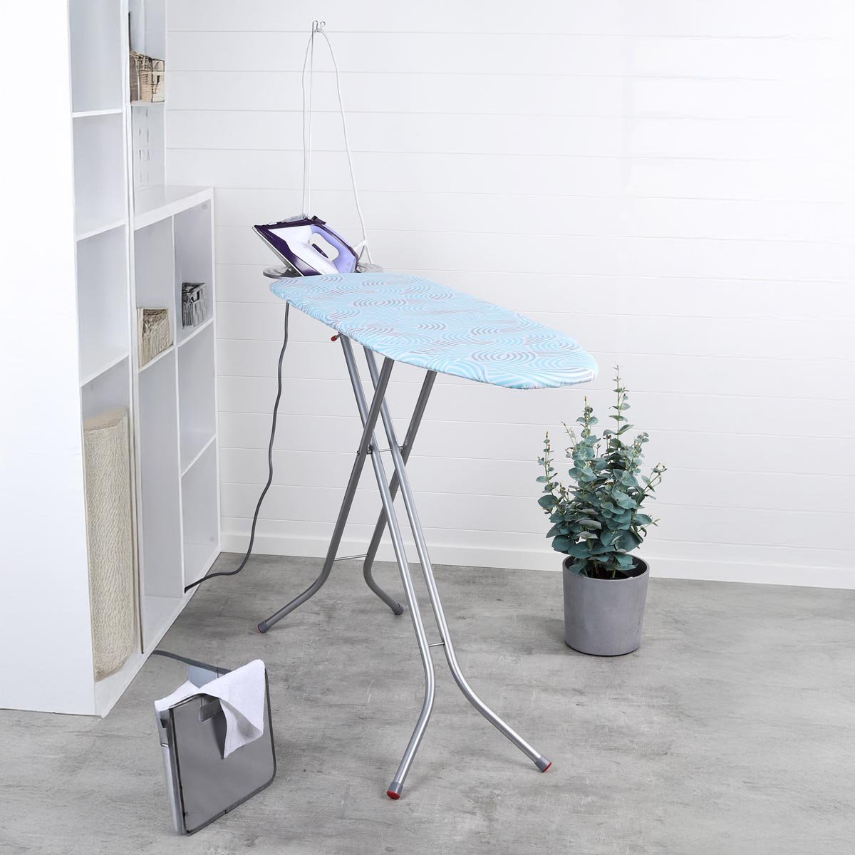 Robustní čtyřnohý základový rám (Ø 22 mm) zajišťuje bezpečné postavení při každém žehlení. Prkno je vybaveno zásuvkou a 2metrovým kabelem, takže máte vždy vše po ruce. Dodatečný komfort nabízí odkládací plocha na žehličku.